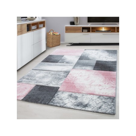 Kurzflorteppich, kariert, rosa, Wohnzimmerteppich, Jute-Rückseite, 100 % PP. Friese (Hundeschnitzerei), Florhöhe: 13 mm, 246.000 Stiche, 2800 g (±5 %)/m², Jute-Rückseite
