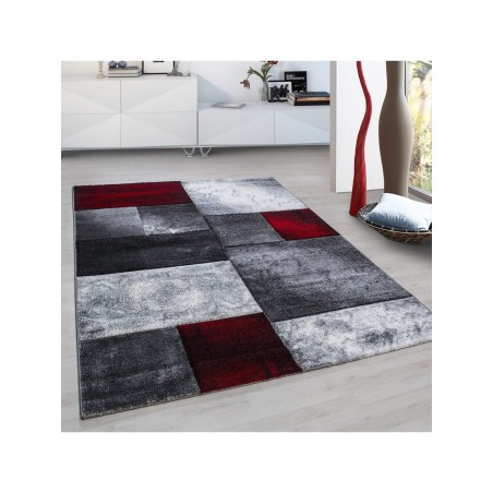 Kurzflorteppich, kariert, rot, Wohnzimmerteppich, Jute-Rückseite, 100 % PP. Friese (Hundeschnitzerei), Florhöhe: 13 mm, 246.000 Stiche, 2800 g/m², Jute-Rückseite