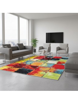 Dieser moderne, mehrfarbige Teppich besticht durch ein dynamisches Patchwork-Muster aus unregelmäßigen Quadraten in intensiven, kontrastierenden Farben. Jedes Feld erzeugt einen einzigartigen, malerischen Effekt, der an Pinselstriche und vielschichtige, künstlerische Texturen erinnert. Die leuchtenden Rot-, Gelb-, Blau- und Grüntöne ergeben eine energiegeladene und ausdrucksstarke Komposition, die sofort ins Auge fällt. Dieses Design verleiht Wohnzimmer, Schlafzimmer oder modernen Wohnräumen eine zeitgenössische und kreative Note und strukturiert den Raum optisch. Dank seiner hohen Dichte und der hochwertigen Webart bietet dieser Teppich angenehmen Liegekomfort und ist äußerst strapazierfähig – ideal für den täglichen Gebrauch.