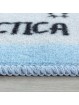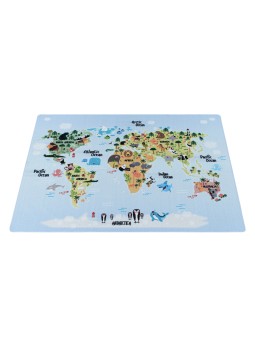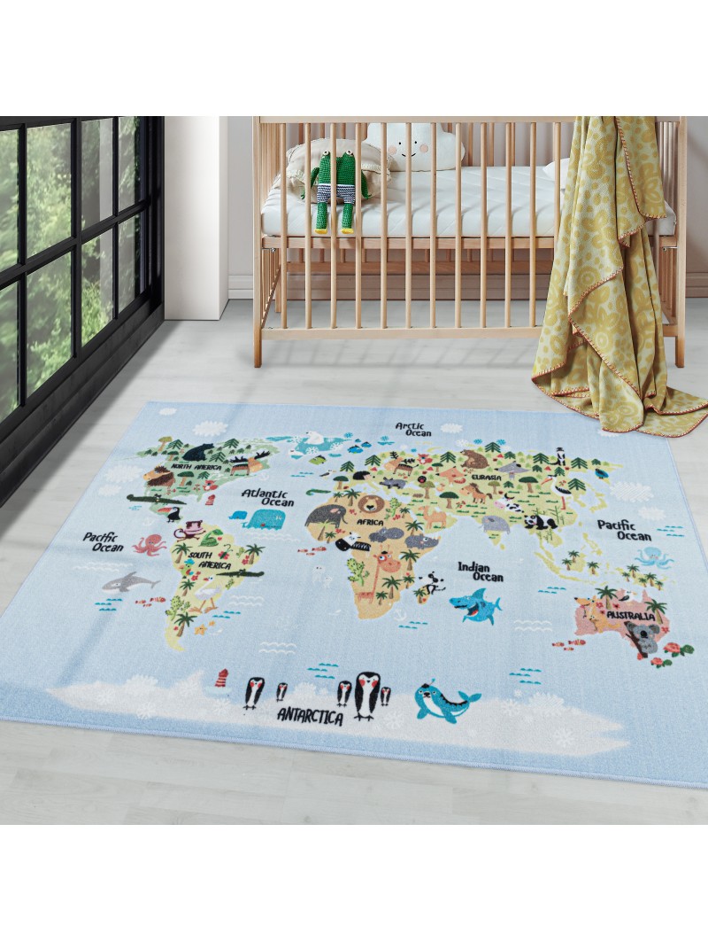 Children's rug with short pile, world map pattern, animals, white and blue.