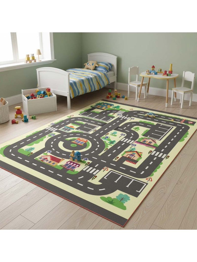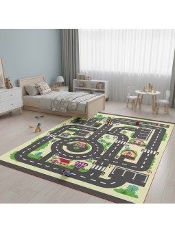 This educational children's rug depicts a fun town with roads, traffic lights, pedestrian crossings, houses, and shops. It's ideal for learning road safety rules while playing with toy cars. Its soft, pleasant surface and colorful design stimulate children's imaginations. Suitable for children's bedrooms, playrooms, nurseries, and preschools. High-quality digital printing and a non-slip backing ensure safe use.