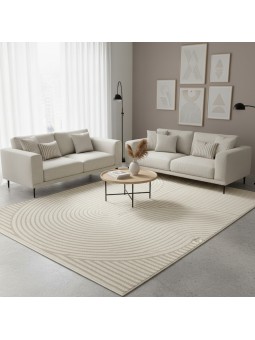 This indoor rug is distinguished by its geometric design sculpted in relief , composed of curved lines and textured surfaces that create a modern and soothing visual effect.