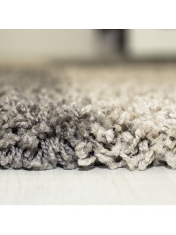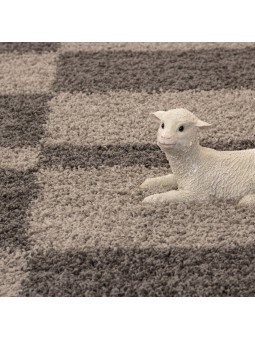 Taupe shaggy rug decorated with a modern geometric pattern. Its long pile offers a soft and warm feel, ideal for the living room or bedroom.