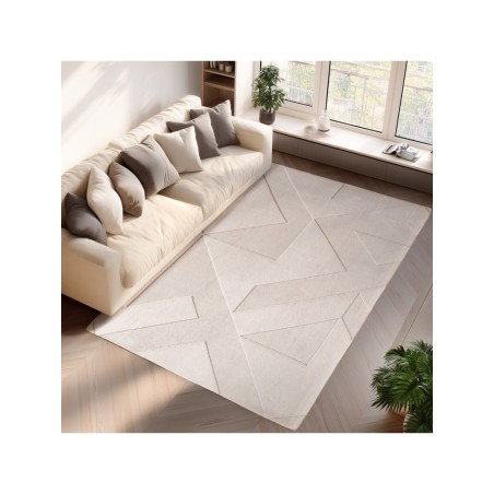 Bohemian rug with geometric patterns, solid cream color, soft, easy-care, washable, 3D effect for living room and bedroom, 100% microfiber, pile height: 12 mm, 1150 g/m², cotton backing