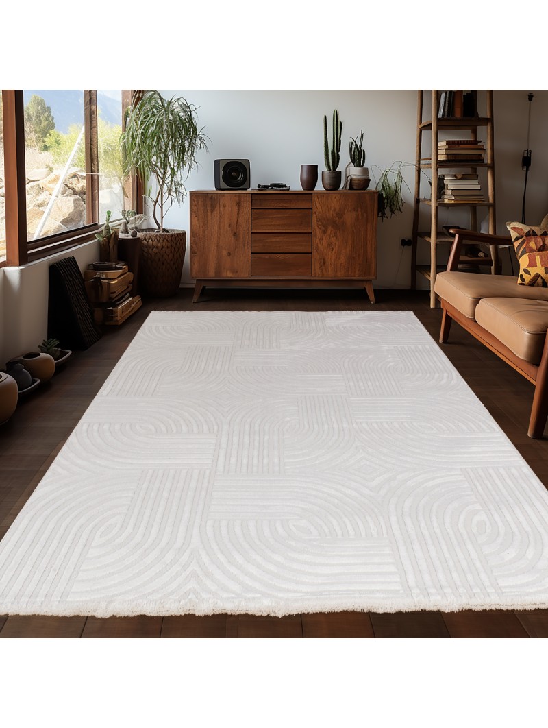 Living room rug with raised tile pattern, Scandinavian bohemian style, soft, cream