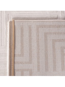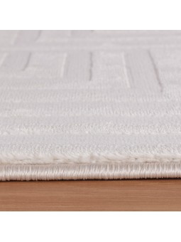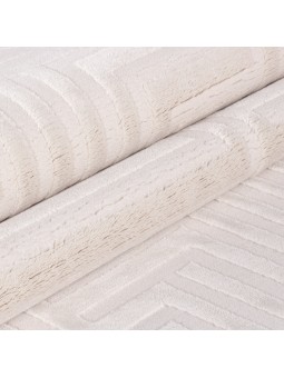 Living room rug with raised geometric patterns, Scandinavian bohemian style, soft, cream, jute backing.