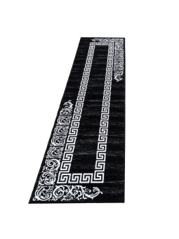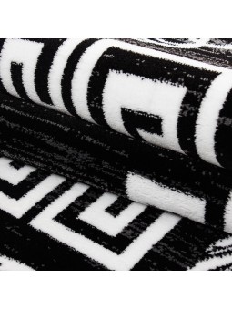 Decorative rug with a geometric Greek meander pattern in contrasting white with baroque scrolls in the corners. The overall effect creates a graphic and elegant backdrop, ideal for a living room, entryway, or office. Soft texture, rich colors, and easy care.