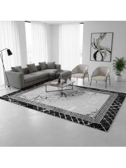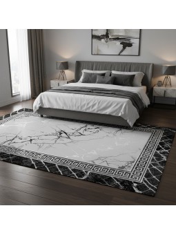 This modern rug plays on the elegance of gray and black marble combined with a refined Greek key border for a sophisticated interior. Thanks to its digital printing technology, the details are crisp, the colors long-lasting, and the rendering highly realistic. With a pile height of 6-7 mm, it is comfortable underfoot and perfectly suited to living areas such as the living room, bedroom, or office. Its non-slip backing ensures excellent grip on the floor. Easy to care for, washable, and compatible with underfloor heating systems.