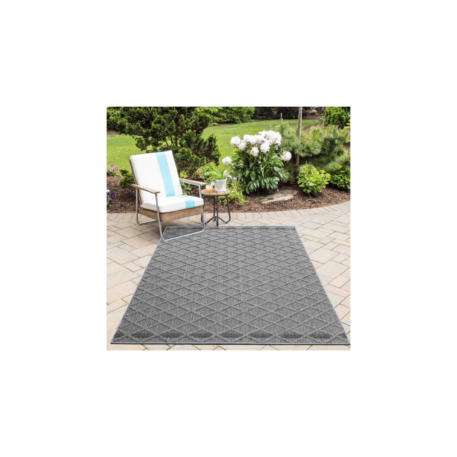 Outdoor rug, grey, suitable for patio, balcony, or kitchen, with a jute backing