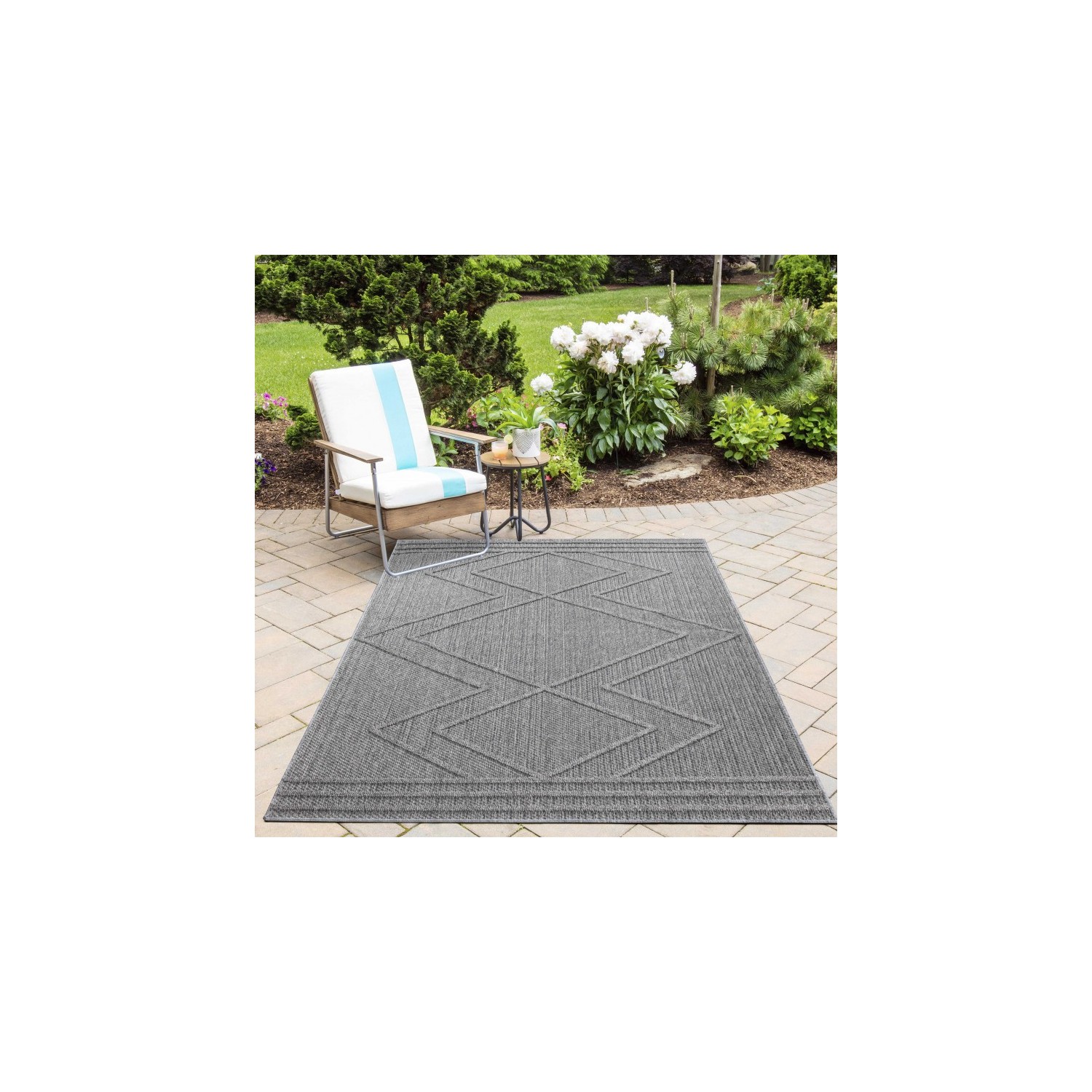 Geometric zigzag checkered rug for balconies, kitchens, terraces, and outdoor/indoor use. Grey.