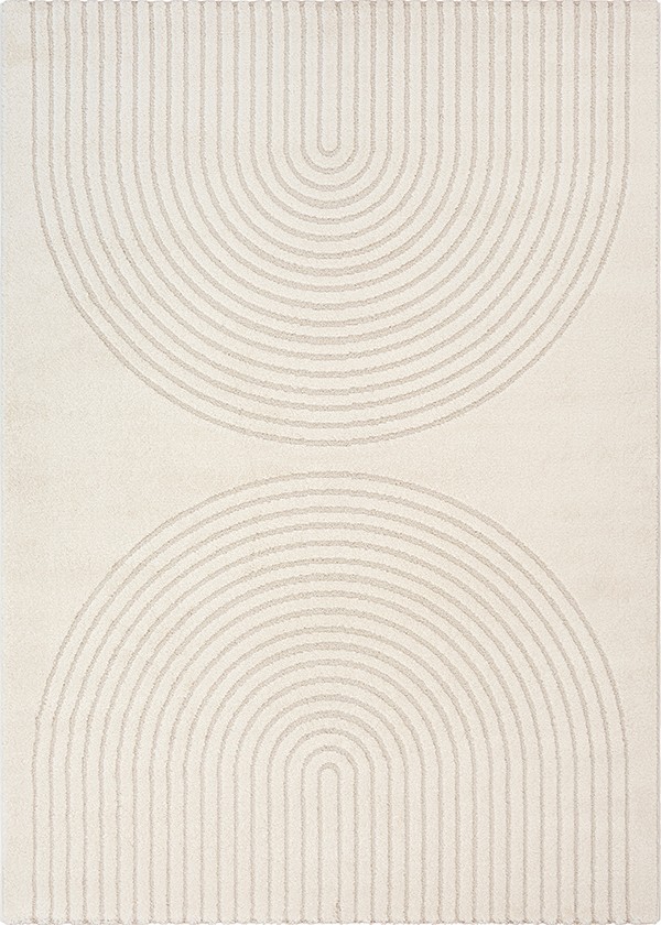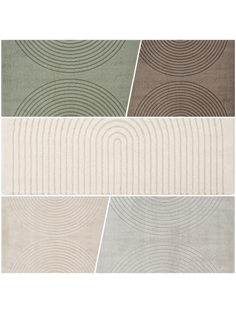 This modern rug captivates with its minimalist pattern of repeating arc shapes, creating a soothing and harmonious visual effect. Inspired by contemporary architectural lines, its design conveys a sense of depth and symmetry while remaining understated and elegant.