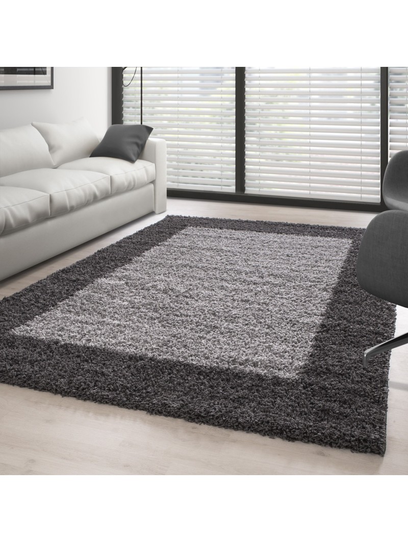 Alfombra suave y peluda con un borde decorativo en gris bicolor. Su pelo largo crea una sensación cálida y confortable a diario. Perfecta para el salón o el dormitorio en un interior moderno.