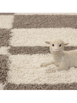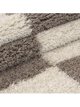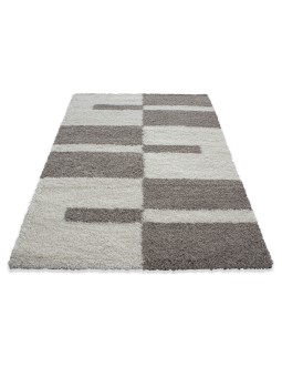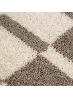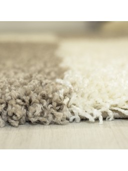 Alfombra beige de pelo largo con modernos motivos geométricos. Su pelo largo ofrece una sensación suave y cálida, ideal para crear un ambiente acogedor en el salón o el dormitorio.