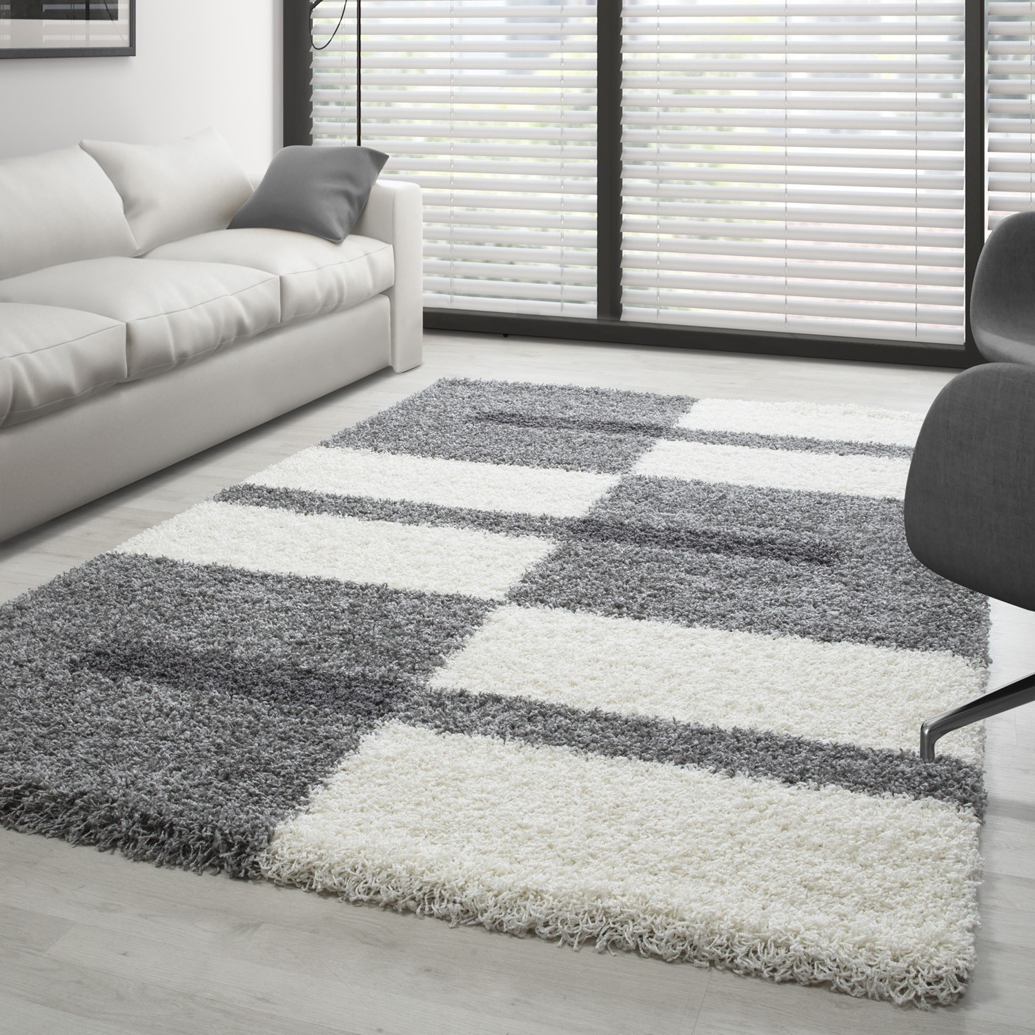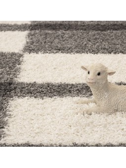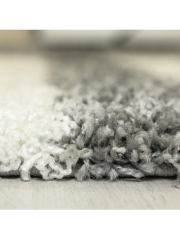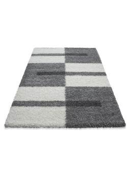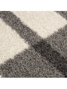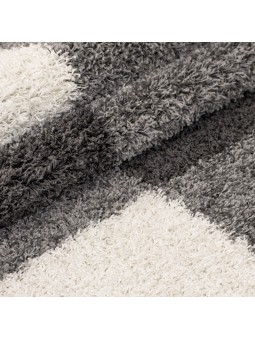 Alfombra peluda gris claro con un moderno diseño geométrico. Su pelo largo proporciona suavidad y comodidad para crear un ambiente cálido en el salón o el dormitorio.