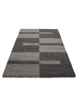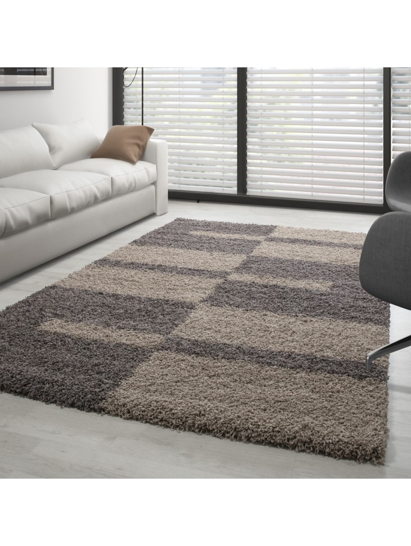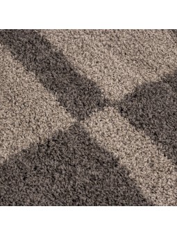 Alfombra peluda color topo decorada con un moderno estampado geométrico. Su pelo largo ofrece una sensación suave y cálida, ideal para el salón o el dormitorio.
