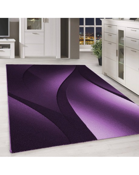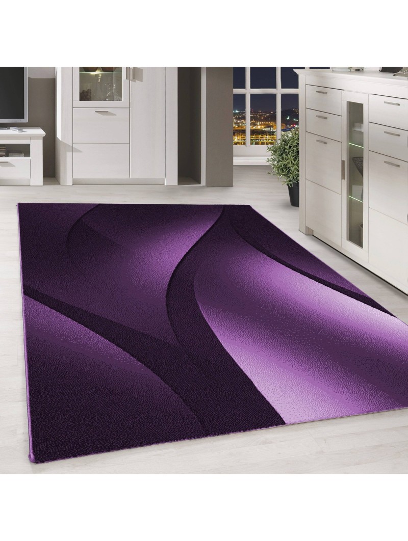 Alfombra de diseño moderna, de pelo corto, con ondas ópticas abstractas, en negro, malva y blanco.