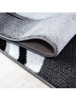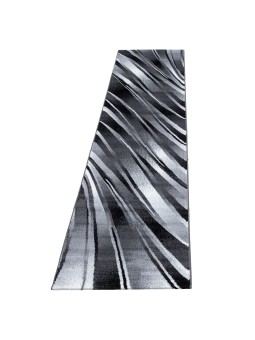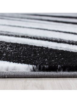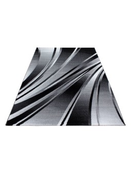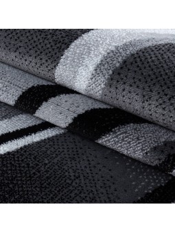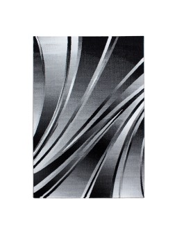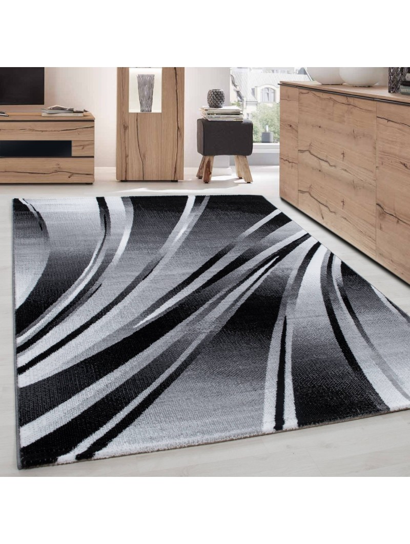 Alfombra moderna con patrón abstracto de curvas fluidas en tonos negros y grises, que aporta un toque contemporáneo y dinámico a su interior. Tejido a máquina – Material: 100% PP Heatset – Altura del pelo: 9 mm – Peso: 1,9 kg/m². Superficie suave, buena durabilidad y fácil mantenimiento. Apto para calefacción por suelo radiante. Certificado OEKO-TEX® Standard 100 , libre de sustancias nocivas. Uso: Sala, Dormitorio, Comedor, Pasillo, Oficina. Nota: Pueden ocurrir ligeras variaciones de color según la pantalla y la iluminación.