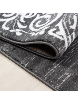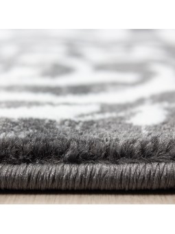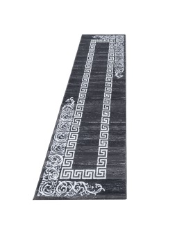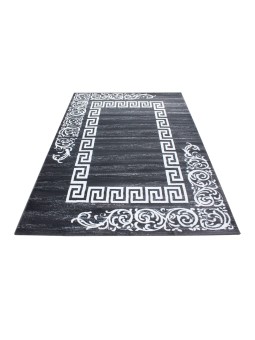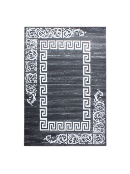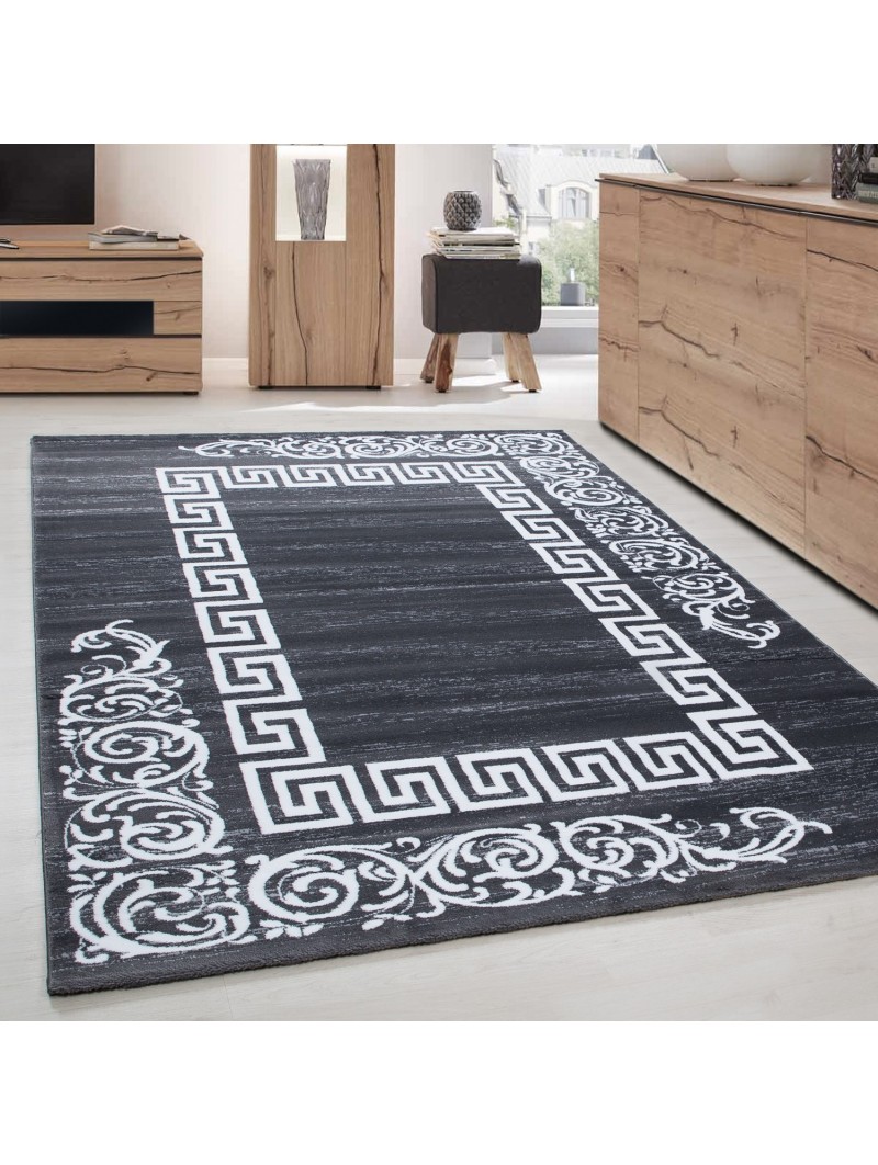 Alfombra decorativa con un borde geométrico blanco de meandro griego y arabescos barrocos estilizados en dos caras. Un efecto gráfico contemporáneo, ideal para salones, oficinas y recibidores modernos. Suave al tacto, colores duraderos y fácil de cuidar.
