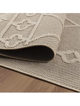 Alfombra de cuadros geométricos en tonos beige y crema para balcones, cocinas, terrazas y uso exterior/interior.