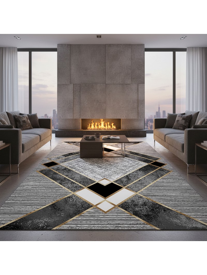 Ce tapis moderne avec impression digitale se distingue par ses formes géométriques élégantes en gris, noir et doré sur une base texturée. Il offre un rendu visuel sophistiqué et une grande durabilité des couleurs. Grâce à sa surface lavable, son toucher doux et son dos antidérapant, il convient parfaitement aux salons contemporains, chambres ou bureaux. Une décoration chic pour un intérieur moderne et raffiné.
