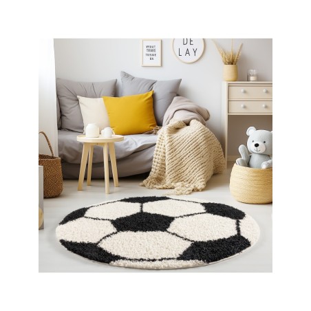 Tapis pour enfant, Conception de football, Couleur Noir, Tapis pour Chambre d'enfants, dos en jute,100 % PP. Shaggy, Hauteur des poils: 50 mm, 57.600 Points, 1950 gr (±%5)M2, Dos en Jute