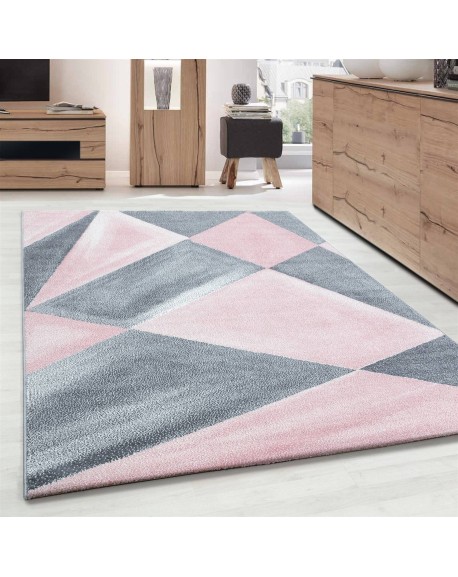 Tappeto dal design moderno, motivi geometrici, pelo corto, grigio, rosa, bianco maculato