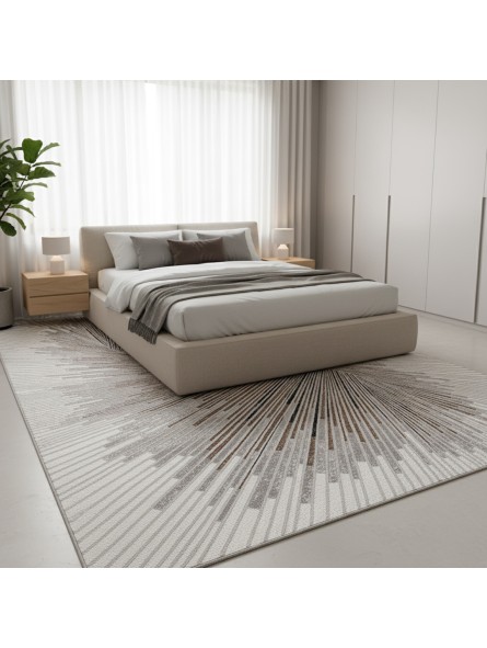 Questo moderno tappeto grigio e crema presenta un sorprendente motivo astratto composto da linee sottili e radianti che sembrano turbinare dal centro. La composizione dinamica crea un effetto visivo che ricorda una spirale o un'esplosione di raggi di luce, conferendo profondità ed energia al design complessivo. Le tonalità di grigio, crema e gli accenti caldi creano un elegante contrasto, mantenendo al contempo un aspetto equilibrato e contemporaneo. Questo motivo grafico cattura naturalmente l'attenzione e diventa il punto focale di un soggiorno, di una camera da letto o di qualsiasi spazio abitativo moderno. Grazie alla sua texture fitta e alla tessitura precisa, il tappeto offre una superficie confortevole e un'eccellente resistenza per l'uso quotidiano.