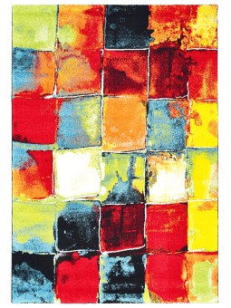 Modern, veelkleurig vloerkleed met een artistiek abstract...