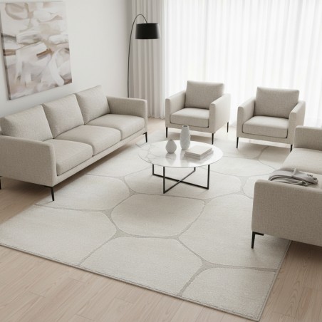 Dit moderne vloerkleed in crèmekleur is ontworpen met een patroon dat doet denken aan natuurlijke steenstructuren, opgebouwd uit onregelmatige vormen met een subtiel reliëf. Het gestructureerde oppervlak zorgt voor visuele diepte en een rustige, verfijnde uitstraling. Dankzij het evenwichtige ontwerp past het tapijt moeiteloos in woonkamers, slaapkamers of moderne leefruimtes en voegt het karakter toe zonder het interieur te overheersen. De geweven afwerking biedt stabiliteit en langdurig comfort bij dagelijks gebruik.