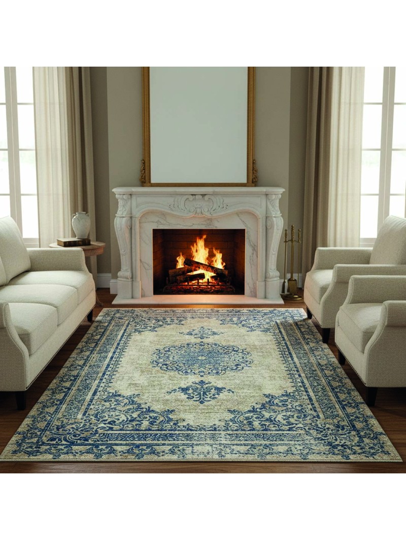 Dit crème-blauwe vintage tapijt brengt stijlvolle charme in elke woonruimte. De zachte structuur en 9 mm poolhoogte geven een comfortabel gevoel aan de voeten. Dankzij digitale print blijft het design helder en levendig. De antislip onderkant zorgt voor veilig gebruik op alle vloertypes, inclusief vloerverwarming. Een prachtige keuze voor woonkamer, slaapkamer of kantoor. Vervaardigd uit kwaliteitsvol Chenille & Katoen mengsel.