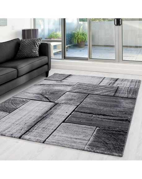 Modern vloerkleed in zwart met panelenmotief geïnspireerd op rustieke houten planken. De grijs-zwarte tinten zorgen voor een natuurlijk en strak visueel reliëf, passend bij industriële en moderne interieurs.