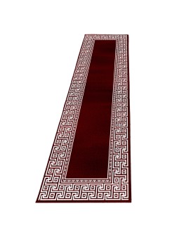 Decoratief bordeaux vloerkleed met klassieke Griekse rand (Greek key / meandermotief) dat een stijlvol en architectonisch kader creëert. Het effen middenvlak zorgt voor een moderne en luxe uitstraling die goed past in eigentijdse en monochrome interieurs.