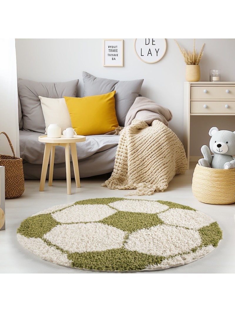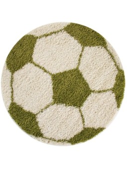 Barnmatta, fotbollsdesign, grön, barnrumsmatta, jutebaksida, 100 % PP. Luggig, lugghöjd: 50 mm, 57 600 stygn, 1950 g/m², jutebaksida
