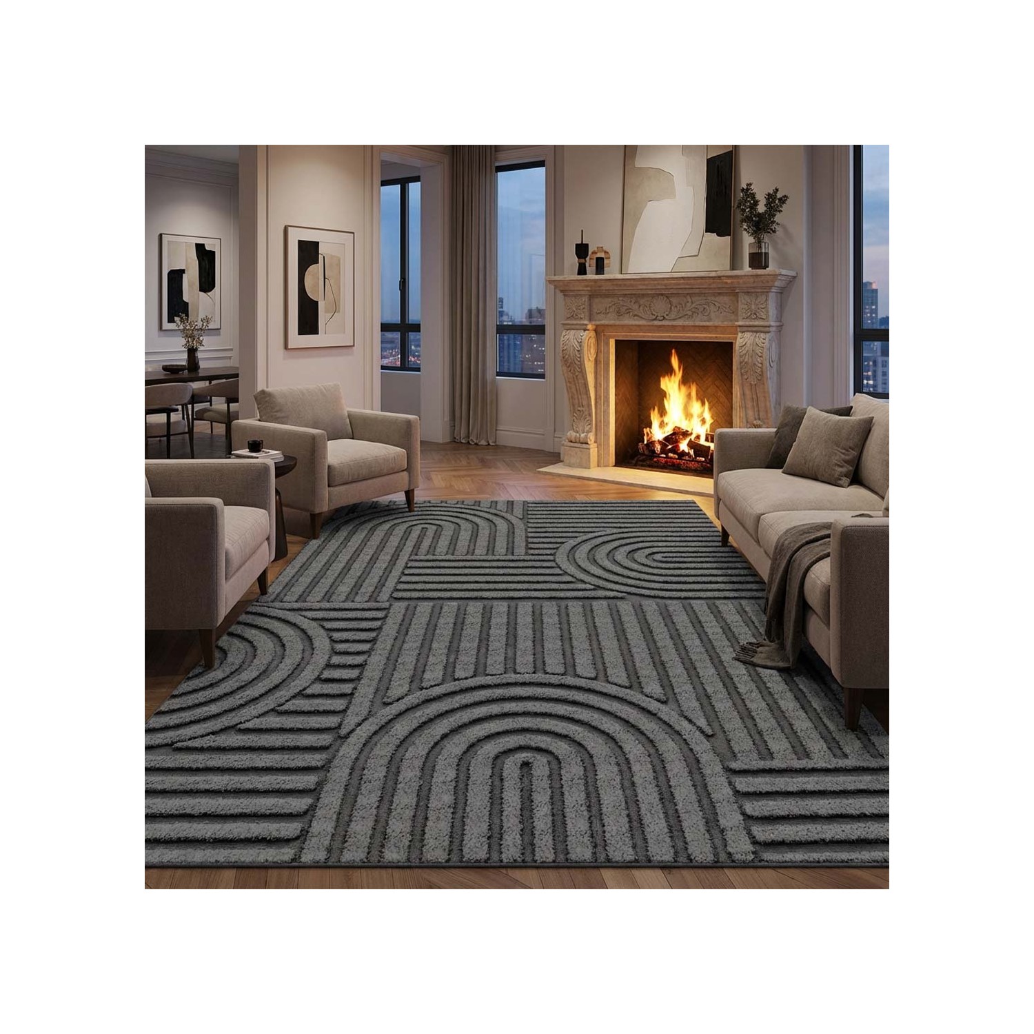 Upptäck denna moderna mörkgrå matta med sina eleganta geometriska mönster, perfekt för en elegant och modern inredning. Tack vare HD digitaltryckteknik förbättrar den ditt utrymme med en exakt och hållbar finish.