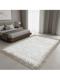 Denna moderna matta i vita och ljusbeige toner ger en ljus och elegant atmosfär till ditt hem. Dess moderna texturerade design smälter sömlöst in i moderna eller minimalistiska vardagsrum, sovrum eller kontor. Dess halkfria baksida garanterar säker användning, medan den mjuka, tvättbara ytan gör den dagliga skötseln enkel. Ett dekorativt och funktionellt val för att förbättra ditt utrymme med enkelhet och förfining.
