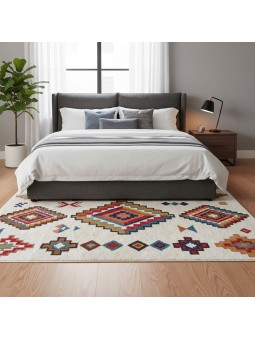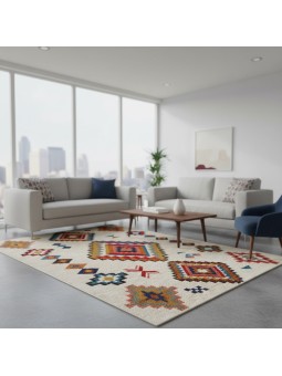 Denna högprecisionsmatta har en modern skandinavisk kelimstil med en krämfärgad bakgrund och flerfärgade geometriska mönster. Tack vare trycktekniken förblir färgerna livfulla och hållbara. Dess mjuka känsla, halkfria baksida och tvättbara yta ger utmärkt komfort i vardagsrummet, sovrummet eller barnrummet. Det perfekta dekorativa tillbehöret för en varm och elegant inredning.