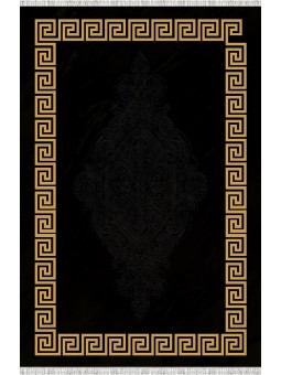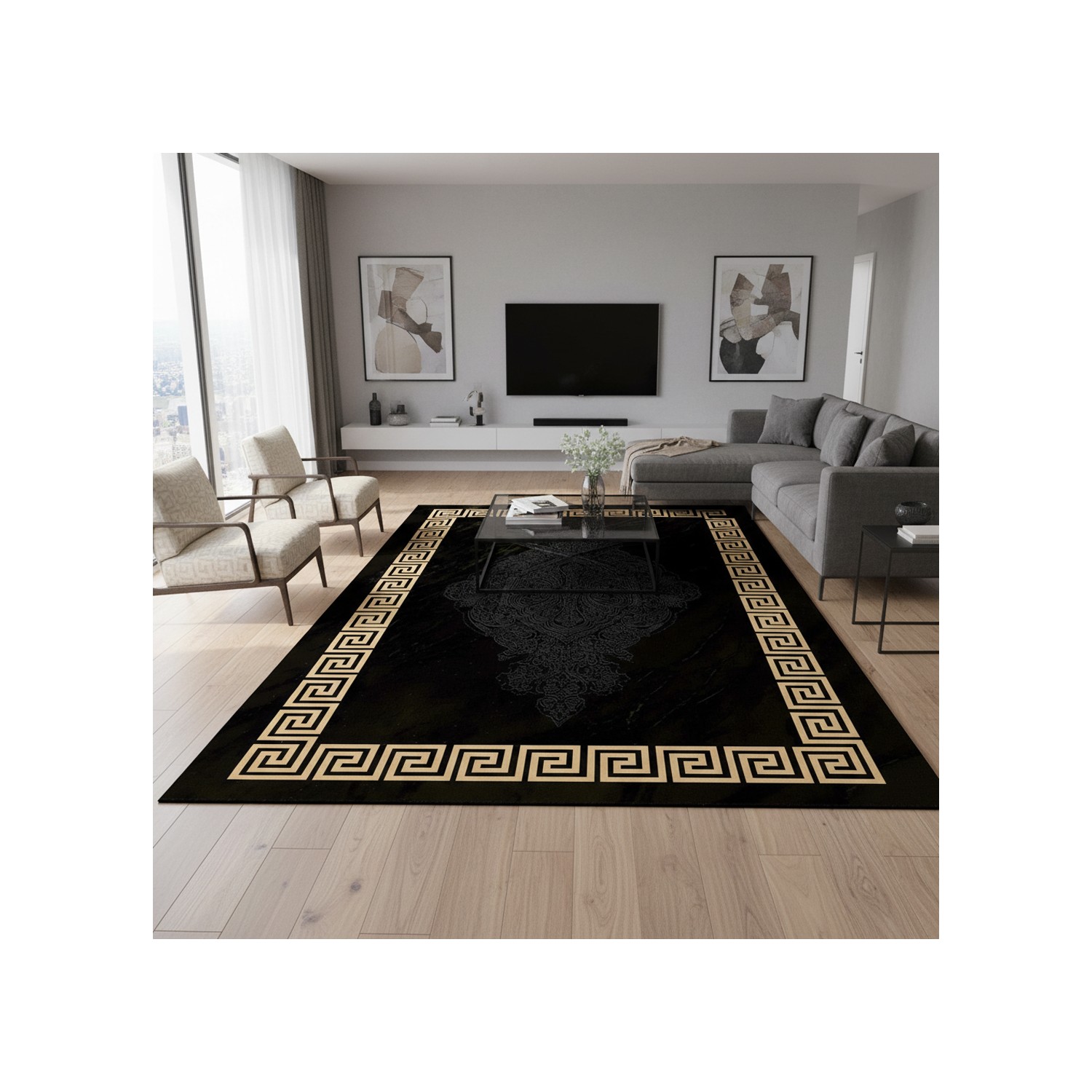Denna moderna matta sticker ut med sin eleganta svarta bas och guldfärgade grekiska nyckelmönster, vilket skapar en lyxig och sofistikerad effekt i ditt hem. Tack vare sin högkvalitativa digitala tryckteknik är detaljerna skarpa och hållbara. Dess mjuka yta och 6-7 mm lugghöjd ger behaglig komfort under fötterna. Med en halkfri baksida förblir den helt stabil även på släta golv. Lättskött, tvättbar och kompatibel med golvvärme, är den idealisk för moderna vardagsrum, sovrum, kontor eller entréer.