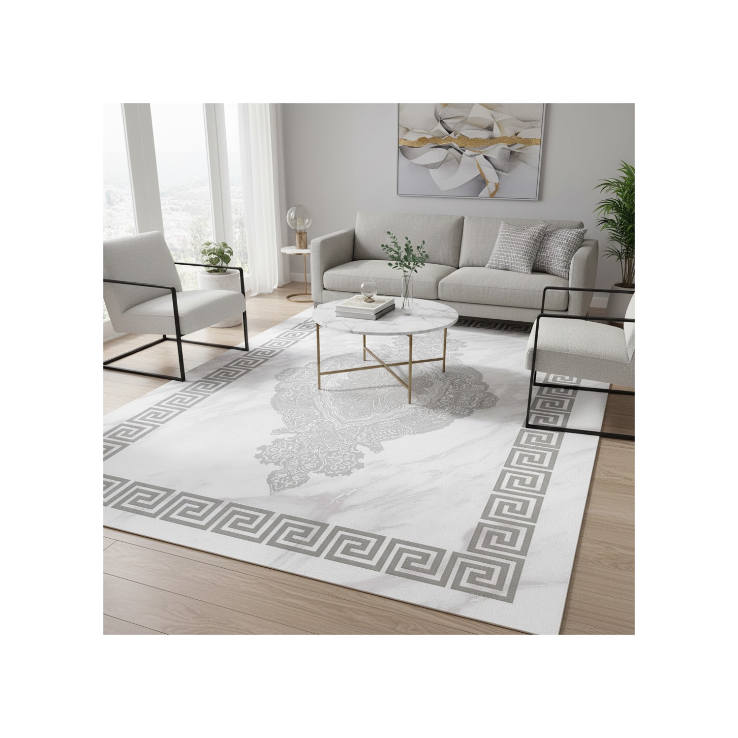 Denna moderna matta kombinerar elegansen i vitt och grått med ett raffinerat grekiskt motiv som ger karaktär till din inredning. Det högkvalitativa digitaltrycket säkerställer en exakt och långvarig visuell representation. Dess mjuka yta med en lugghöjd på 6–7 mm ger en behaglig känsla. Den halkfria baksidan garanterar optimal stabilitet på alla typer av golv. Lätt att rengöra, tvättbar och kompatibel med golvvärme, passar den perfekt för moderna vardagsrum, sovrum, kontor eller entréer.