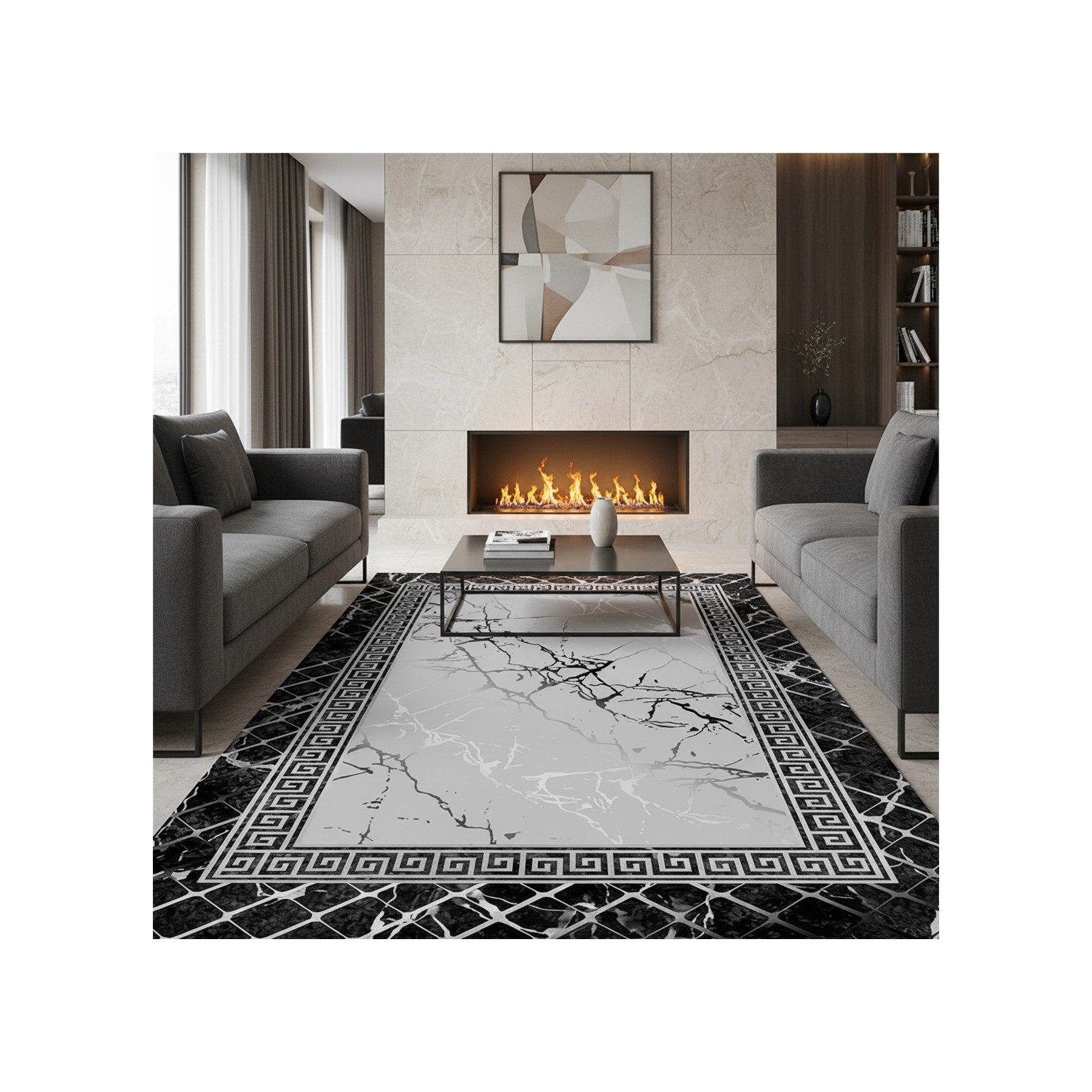Denna moderna matta spelar på elegansen hos grå och svart marmor i kombination med en raffinerad grekisk nyckelkant för en sofistikerad inredning. Tack vare sin digitala tryckteknik är detaljerna skarpa, färgerna hållbara och återgivningen mycket realistisk. Med en lugghöjd på 6-7 mm är den bekväm att ta och passar perfekt i bostadsutrymmen som vardagsrum, sovrum eller kontor. Dess halkfria baksida garanterar utmärkt grepp mot golvet. Lätt att sköta, tvättbar och kompatibel med golvvärmesystem.