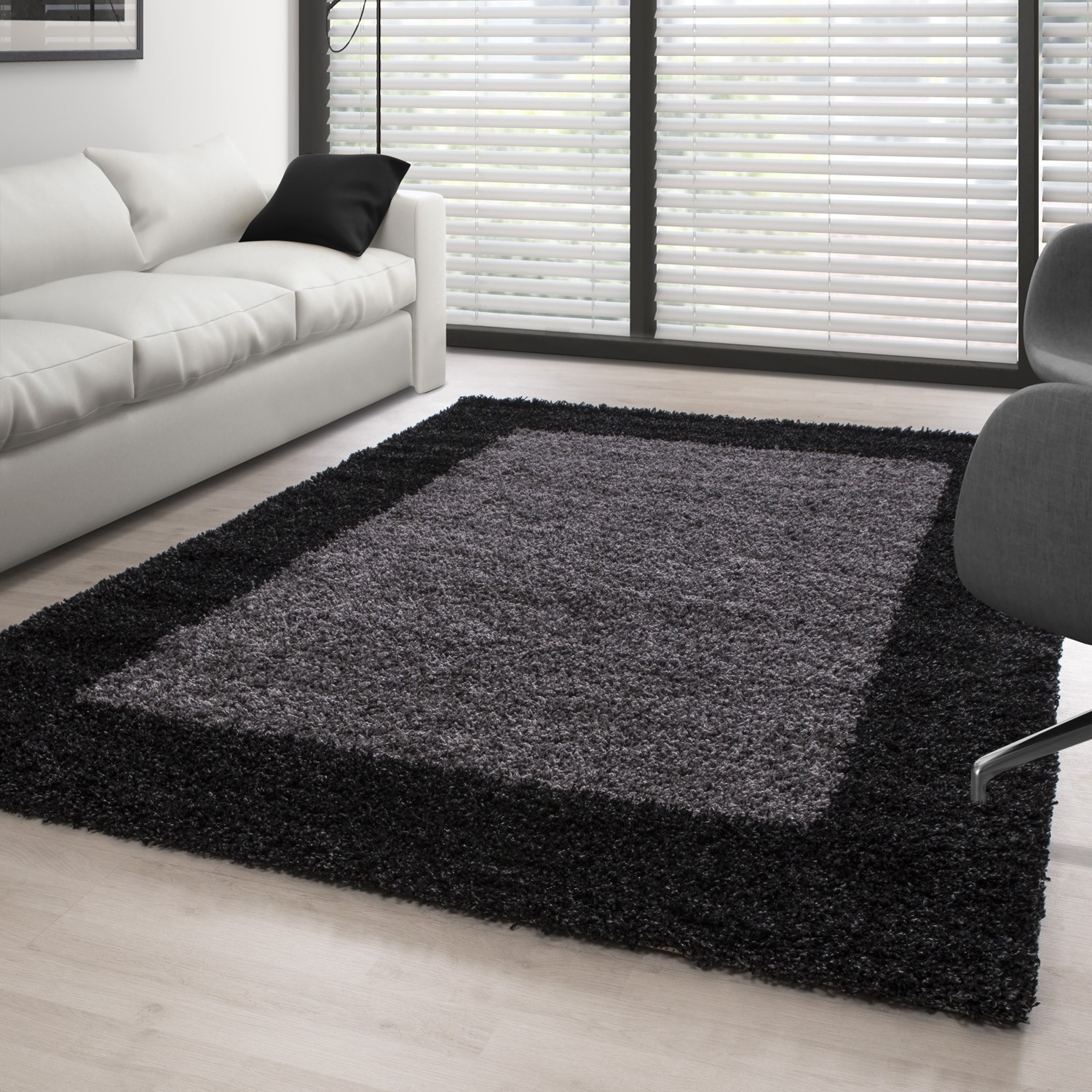 Mjuk, rufsig matta med dekorativ kant i en elegant antracitfärgad ton. Dess långa fibrer ger varm komfort för vardagsbruk, perfekt för vardagsrummet eller sovrummet i en modern inredning.