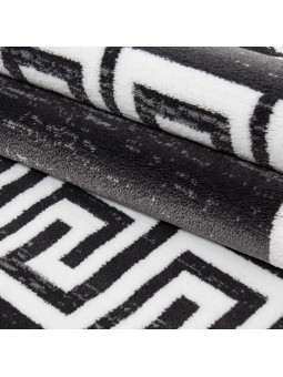 Dekorativ matta med en vit grekisk meandermönsterkant och stiliserade barocka arabesker på två sidor. En modern grafisk effekt, lämplig för moderna vardagsrum, kontor och entréer. Mjuk vid beröring, hållbara färger och lätt att sköta.