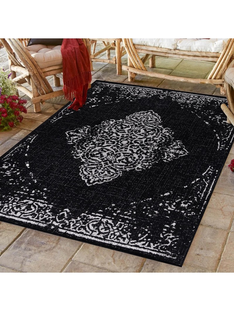 Utomhusmatta, Vintagedesign, Svart, Matta för terrass/balkong/kök, Polypropylenbaksida, 100 % PP. Värmestärkande fritter, Lugghöjd: 3 mm, 86 900 punkter, 1300 g (±5 %) m², Polypropylenbaksida